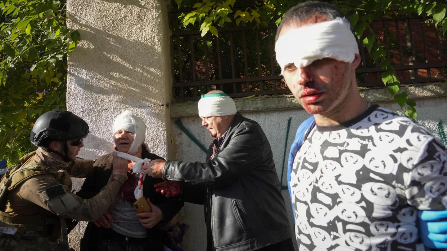 Un grupo de personas que resultó herida tras el estallido de uno de los misiles rusos en Kiev.