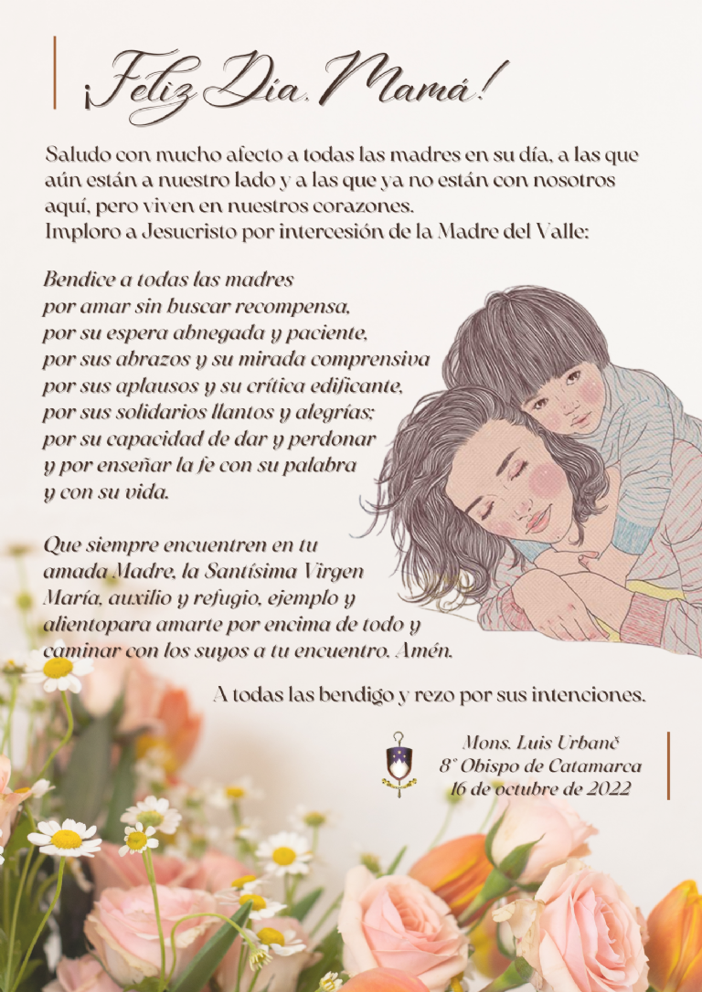 Este domingo 16 de octubre se celebra en toda la República Argentina el Día de la Madre, tradición que lleva más de 90 años de antigüedad. Por este motivo, el monseñor Luis Urbanc, Obispo de Catamarca, envió un saludo a todas las Madres en su día. Navegación de entradas “¡Dejalo al nene!”: a punta de pistola, un grupo de delincuentes asaltó a un padre y a su hijo de 10 años Esta semana habrá un nuevo aumento en el pan