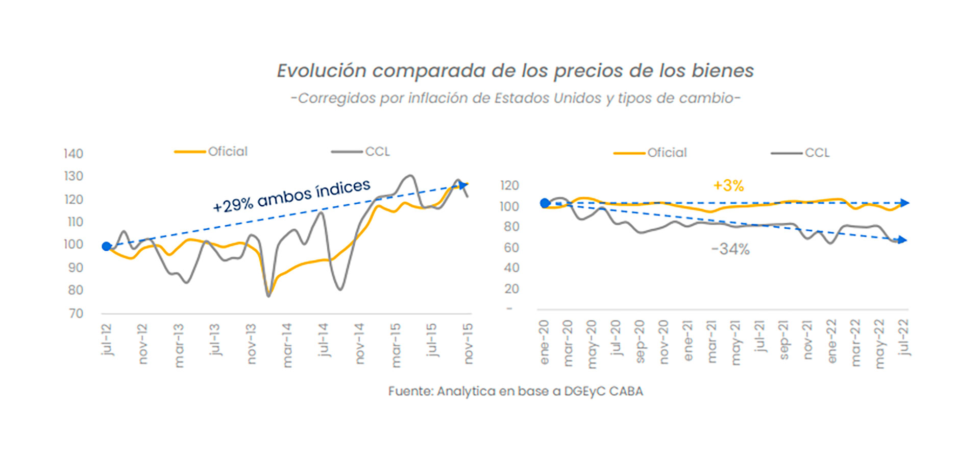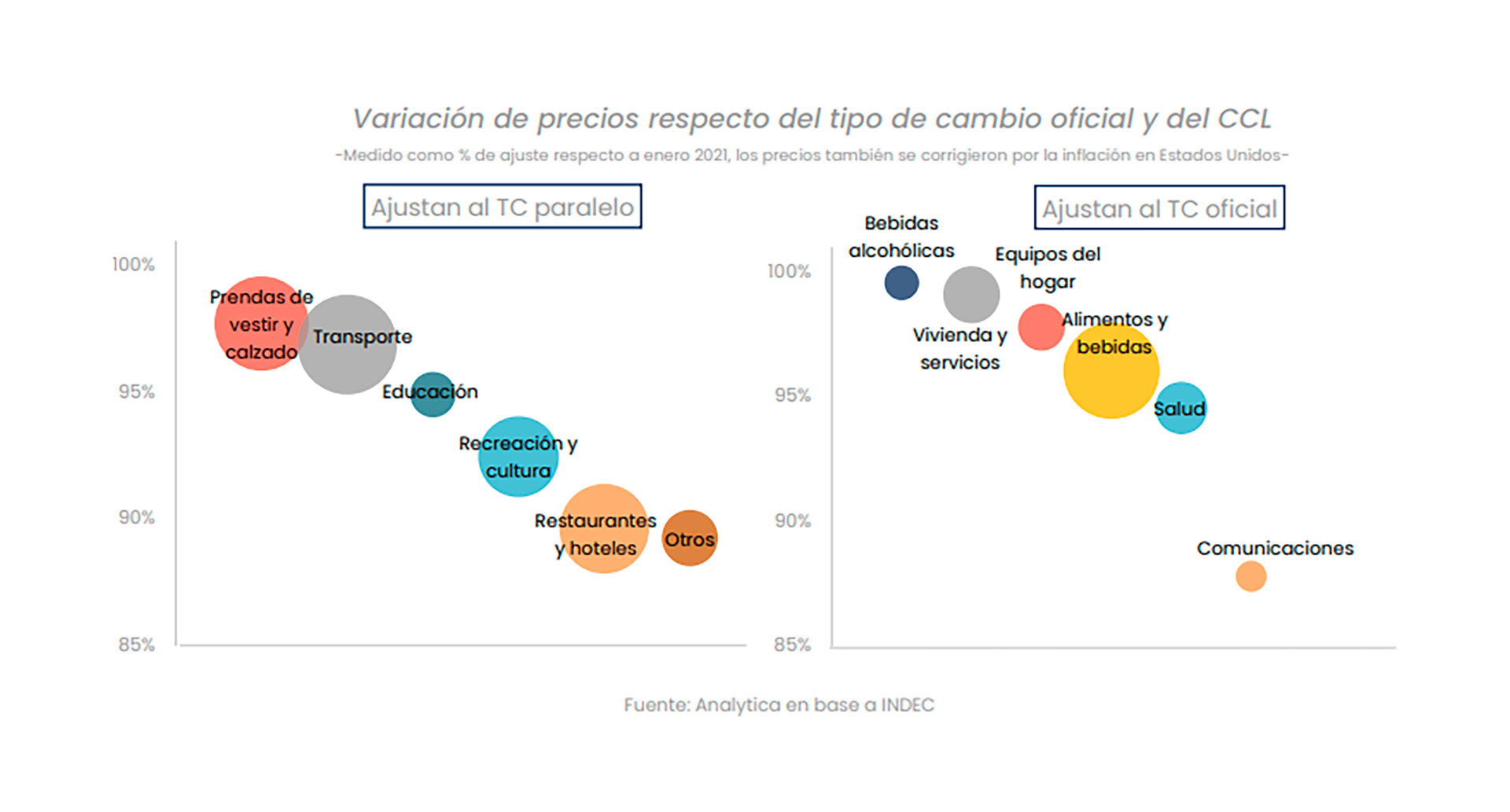 Pero, en cualquier caso, el más inmanejable de los efectos e inmediato de los efectos es el riesgo de espiralización inflacionaria. Sin embargo, tal como advierte el informe de Analytica, con la amplia brecha cambiaria también se están incubando las condiciones para un nuevo rebote inflacionario, ya que los precios de los bienes siguen rezagados respecto a la evolución del dólar bursátil. En este sentido, el relevamiento de la consultora que indagó sobre cuál es el tipo de cambio que define la estructura de costos de empresas y comercios reveló que las cotizaciones financieras se están incorporando cada vez más, lo que anticipa los riesgos devaluatorios, pero que esto aún no ocurre de manera masiva. “En promedio, los precios de los bienes, corregidos por la inflación de los Estados Unidos, evolucionan en línea con el tipo de cambio oficial”, indica el estudio donde se lee también que “la dinámica sectorial revela una importante heterogeneidad en la dinámica de ajuste de los precios. El 57% de los bienes y servicios del índice de precios al consumidor sigue la variación del tipo de cambio oficial y la inflación norteamericana, principalmente porque así lo hacen las alimenticias y los productores de bebidas no alcohólicas, que representan el 27% del total. Del mismo modo responde el rubro de equipamiento del hogar, dentro de los cuales figuran electrodomésticos, bienes no durables y el servicio doméstico con peso mayoritario”.