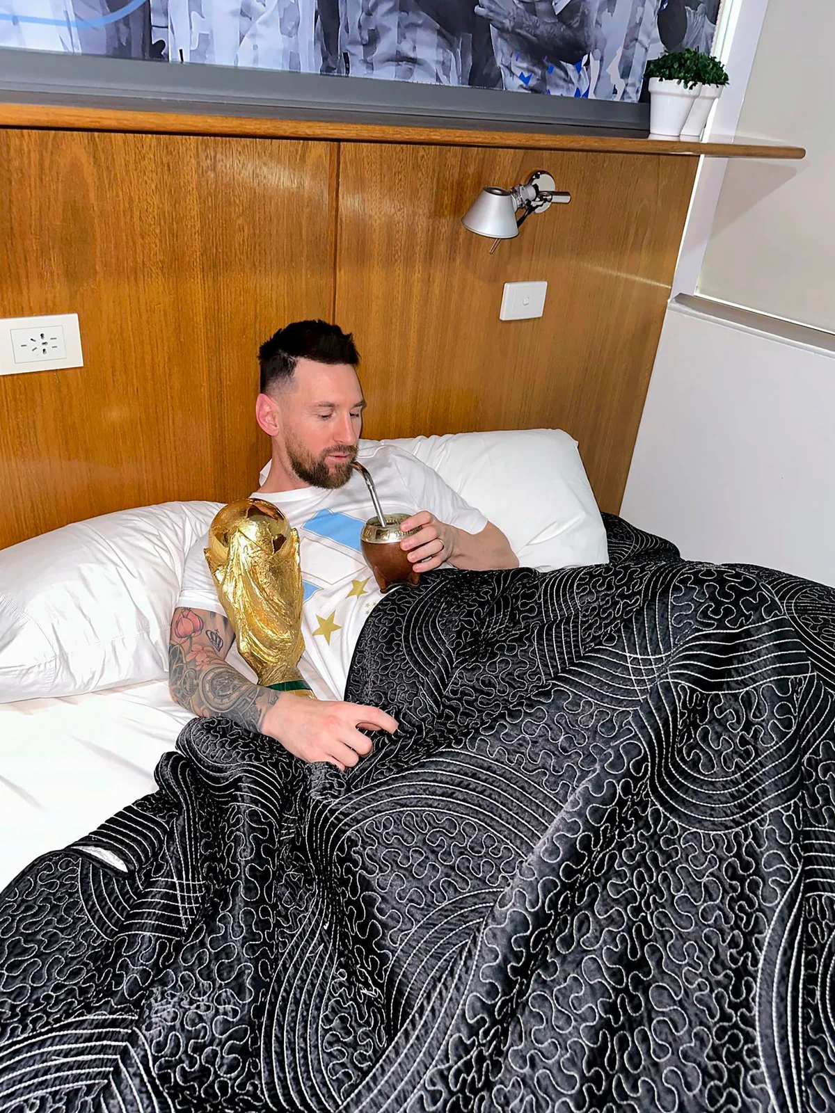 Una vez que los futbolistas se instalaron en el complejo 2 del lugar, de uso exclusivo para la selección mayor, se fueron a descansar. Pero alguien que no durmió sólo. A través de una publicación en su cuenta de Instagram, Lionel Messi se mostró con el trofeo más preciado. Y lo hizo en su cama, la de su habitación de siempre en el predio que visita cada desde que es muy chico.