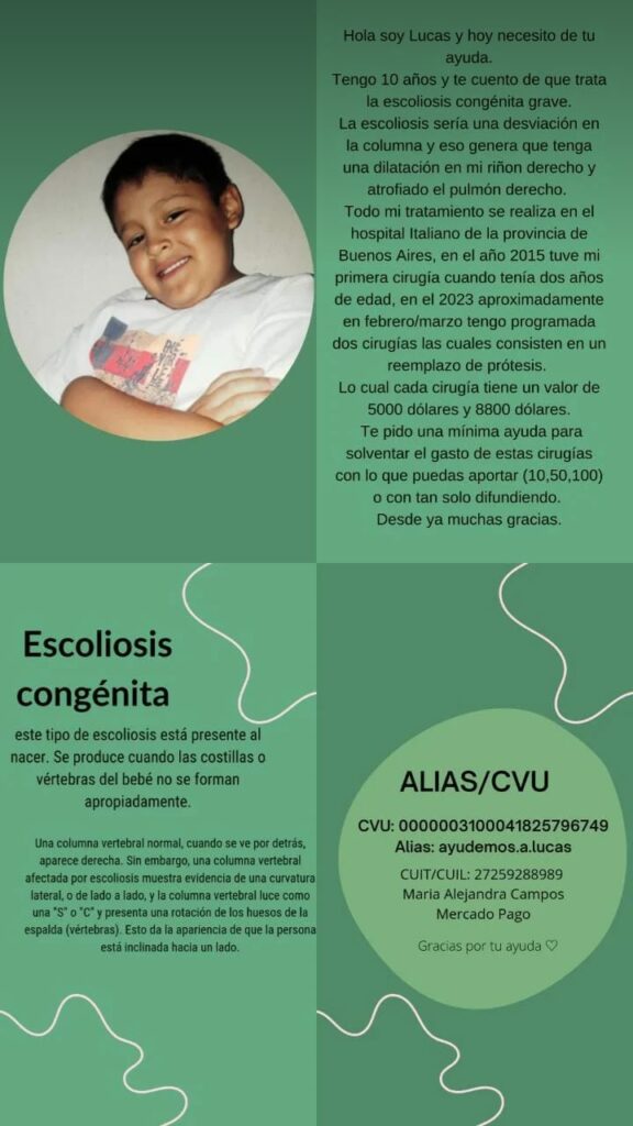 Lucas Aguirre nació con una escoliosis congénita grave. Actualmente tiene atrofiado el pulmón derecho y atrofiado el riñón derecho. Ante la gravedad de cuadro está siendo atendido en el Hospital Italiano de Buenos Aires. Debe realizarse dos operaciones, en las cuales los médicos le cobran como honorarios $5.000 dólares y la segunda $8.800 dólares.