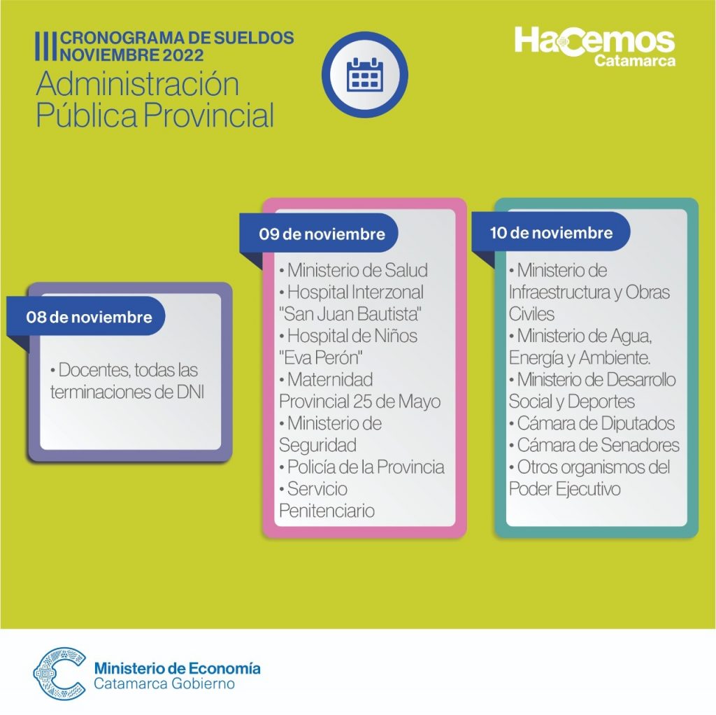 El Ministerio de Economía informa que el pago de sueldos correspondientes a octubre a los empleados de la Administración Pública Provincial, dará inicio el próximo martes 8 de noviembre. Los pagos se acreditarán según el siguiente cronograma: