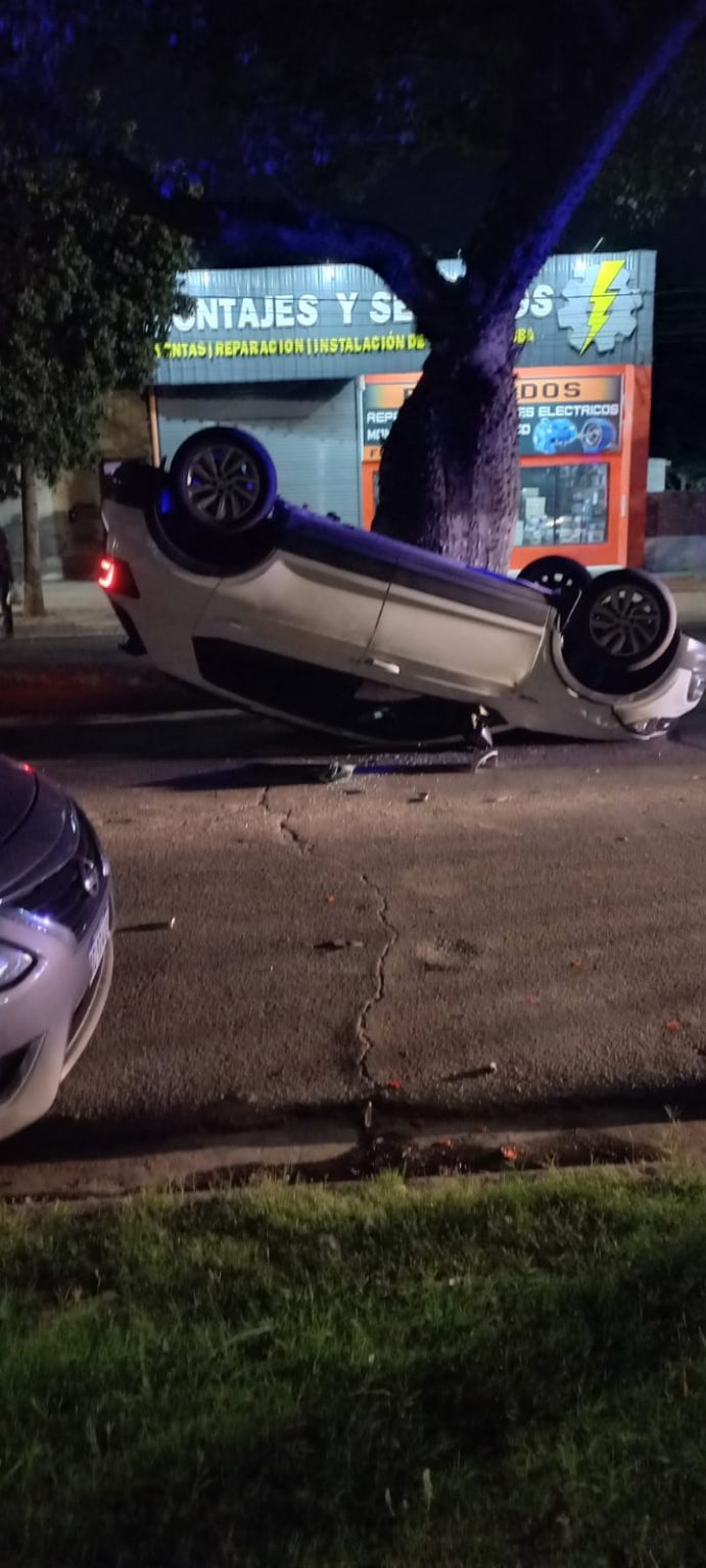 En la tarde de hoy se produjo un vuelco de un auto de color blanco en la intersección de la calle Santa Fe y Vicario y Segura- a dos cuadras del Cementerio Municipal «Fray Mamerto Esquiú»-.